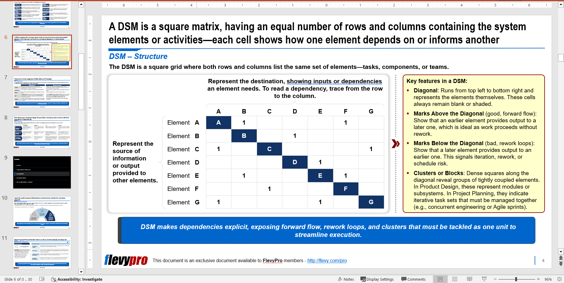 Interested in learning more about the DSM categories, utilization, and commercial tools? You can download an editable PowerPoint presentation on Design Structure Matrix (DSM) here on the Flevy documents marketplace.