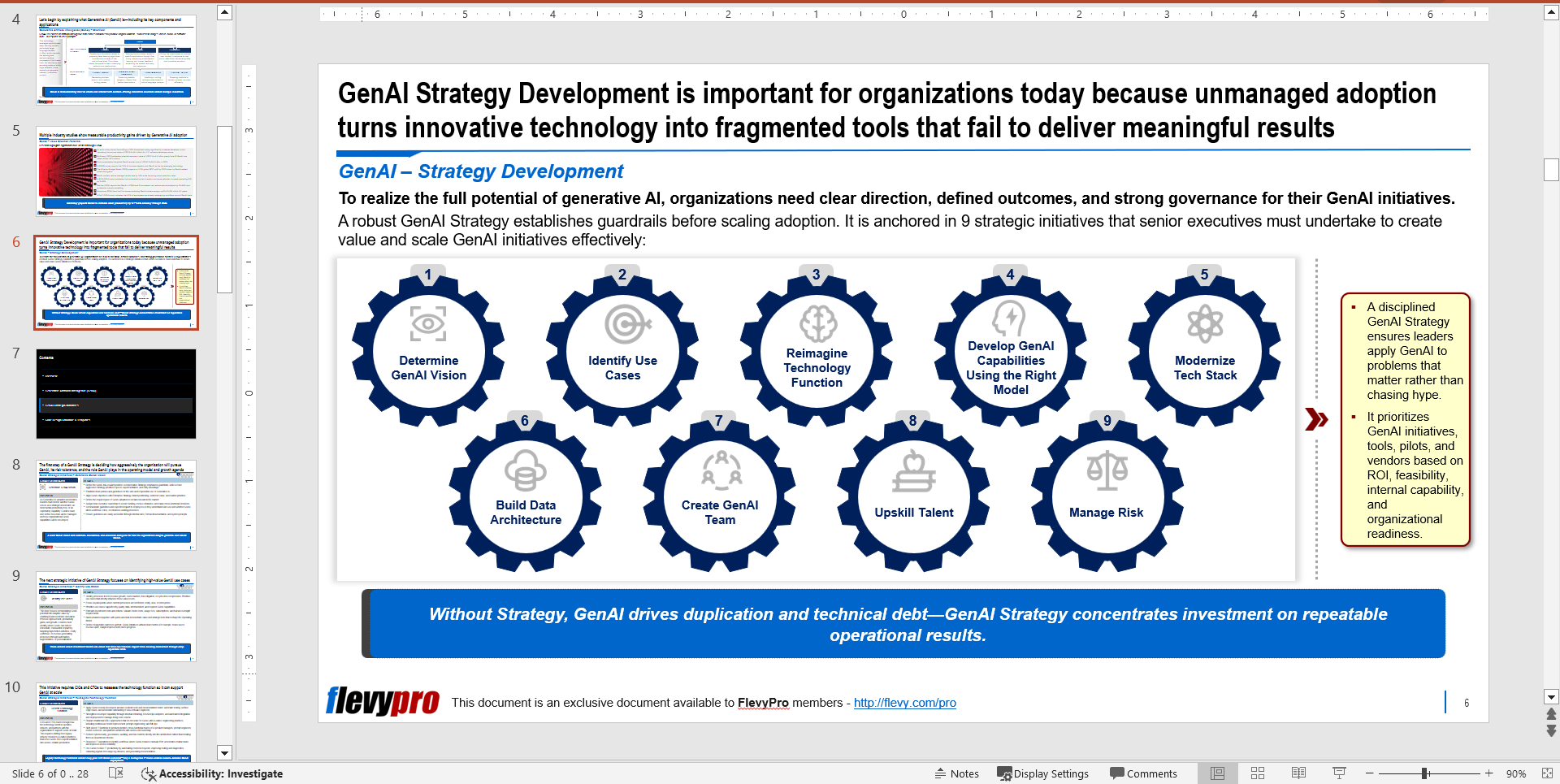 Interested in learning more about the other strategic initiatives? You can download an editable PowerPoint presentation on the GenAI Strategy: 9 Strategic Initiatives here on the Flevy documents marketplace.