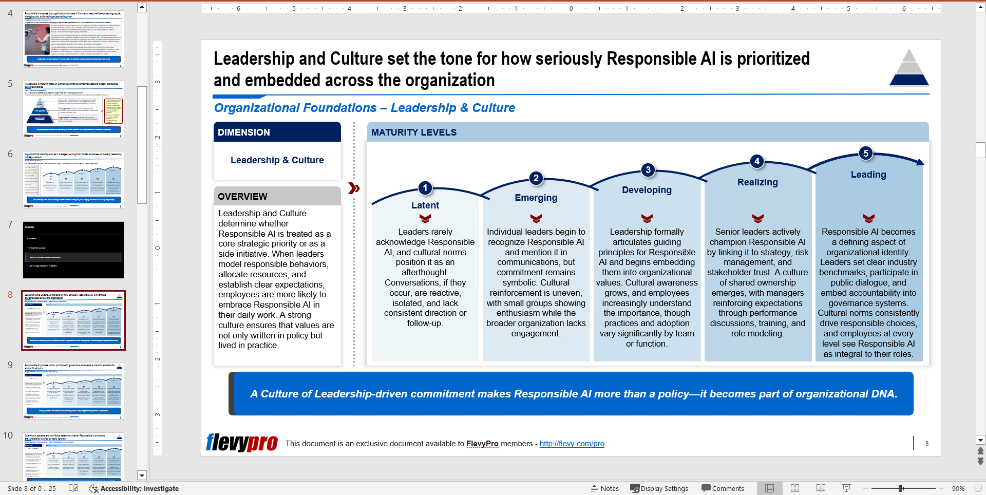 The Maturity Model advances across five stages. Latent signals limited awareness. Emerging shows scattered pilots without ownership. Developing introduces policies, processes, and shared accountability. Realizing integrates practices across products and governance with measurable outcomes. Leading embeds Responsible AI as a cultural and strategic norm that influences external standards and raises the bar for the industry. The deck emphasizes a simple but powerful truth. Each level supports the next, making progress sustainable and scalable. Leaders can use the model to align on a common language, plan investments, and monitor progress consistently across the portfolio. The material also provides slide templates that teams can reuse to manage adoption and track maturity—small detail, large impact on drumbeat.