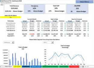 This dashboard will help navigate the financial performance of your hotel with ease. Great visual graphs will aid in seeing key business trends easily and quickly compared to the budget in a flash.