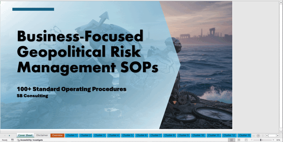 This meticulously crafted Excel template library gives you over 100 expertly-designed Standard Operating Procedures (SOPs) that span across 15 vital geopolitical risk clusters. You'll be empowered with the exact frameworks, processes, and best practices needed to mitigate, assess, and respond to risks in real-time. From strategic governance to crisis management, every angle is covered.