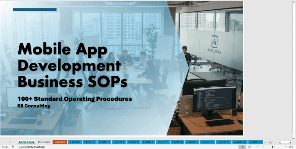 This is a battle-tested, end-to-end Standard Operating Procedures system, delivered as a ready-to-use Excel template, covering every critical function of a modern mobile app business – from strategy and ideation to DevOps, security, marketing, analytics, finance, legal, and HR.