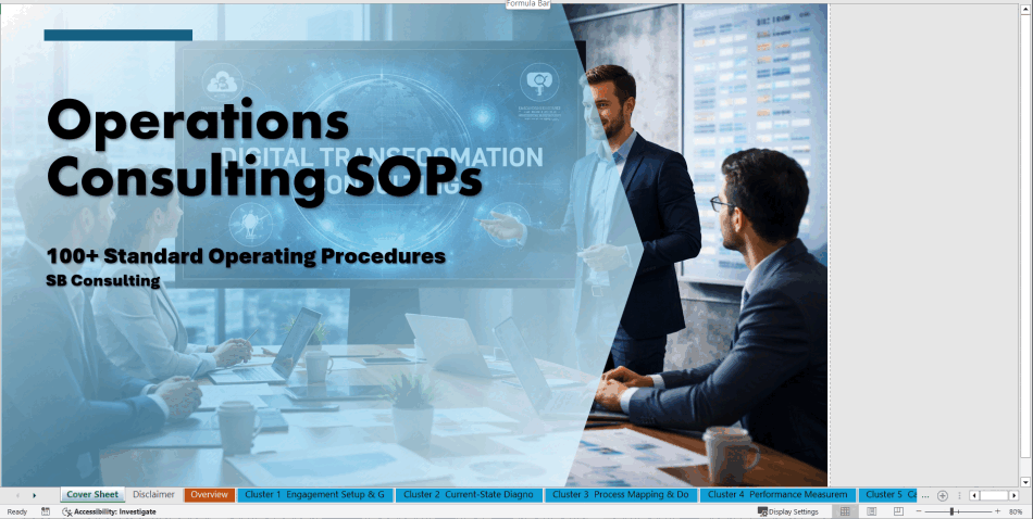 If you sell, manage, or execute operations consulting, operational excellence, transformation, or scale-up initiatives, this Excel SOP template pack becomes your operating backbone.