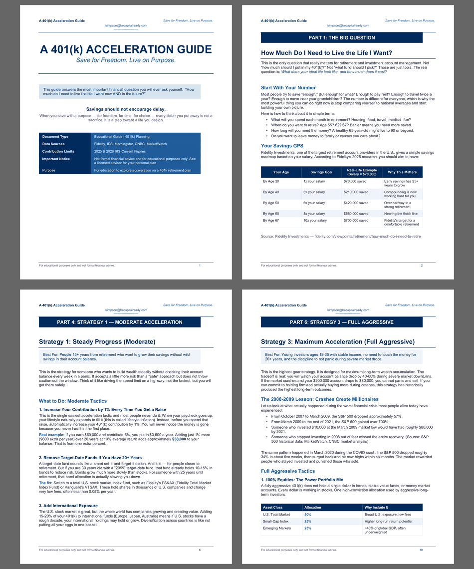 It breaks down, in plain everyday language, how a 401(k) works, how much the government lets you save each year, and three different savings plans based on how fast you want to grow your money. You will learn how even small amounts saved early can grow into hundreds of thousands of dollars over time, why saving is not about giving things up but about buying your future freedom, and exactly what steps to take this month to get started or speed up.