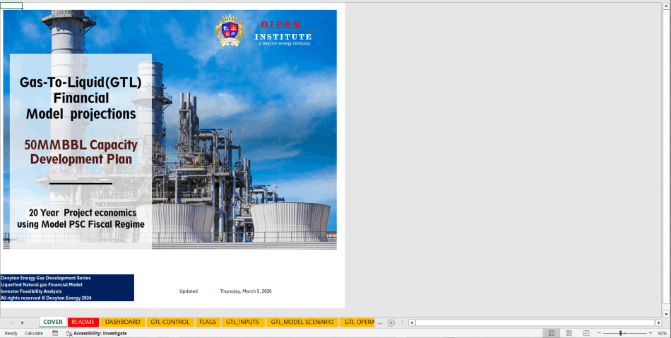 • This model is used to provide a robust economic analysis of a 50,000BBls/ day Gas to liquid(GTL) Processing plant across various product configurations. This model provides useful insights driven by a robust analysis with key cost drivers of capital, operating, fiscal & commercial economic drivers in a typical GTL Development Project