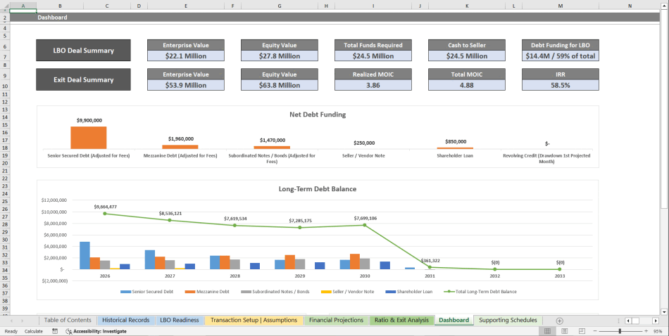 9. Dashboard and Key Ratios: Access a high-level dashboard summarizing the deal. Visualize enterprise value, equity value, debt funding, exit value, MOIC, and IRR. Review charts for debt composition, long-term debt balance trends, profitability metrics, and cash flow performance from operating, investing, and financing activities.