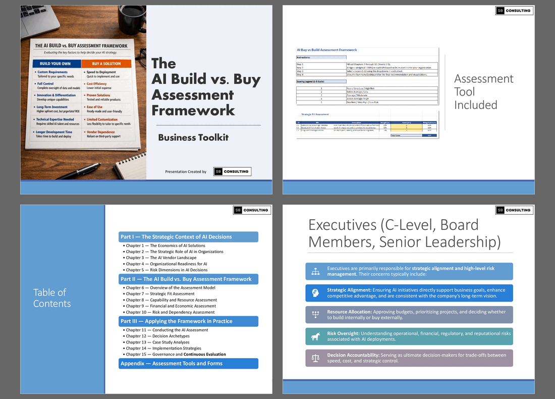 Delivered as a 300+ slide executive-grade PowerPoint, this framework equips leaders with a structured, repeatable, board-ready methodology for deciding when to build AI, when to buy AI, and when to combine both.