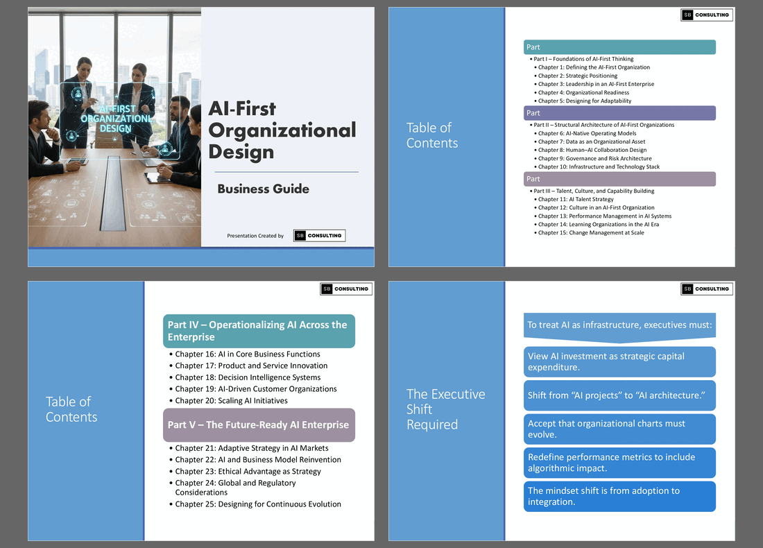 The AI-First Organizational Design Business Guide (500+ Slide PowerPoint) gives you the architecture, language, frameworks, and deployment system to build a future-ready enterprise.