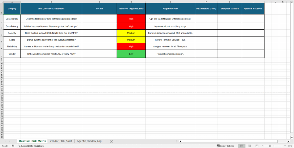 BONUS MATERIAL: This download also includes a complimentary PDF copy of the Executive Briefing: "The AI Quantum Paradox". This strategic guide explains the mathematical urgency behind HNDL risks and serves as the theoretical companion to the Excel framework