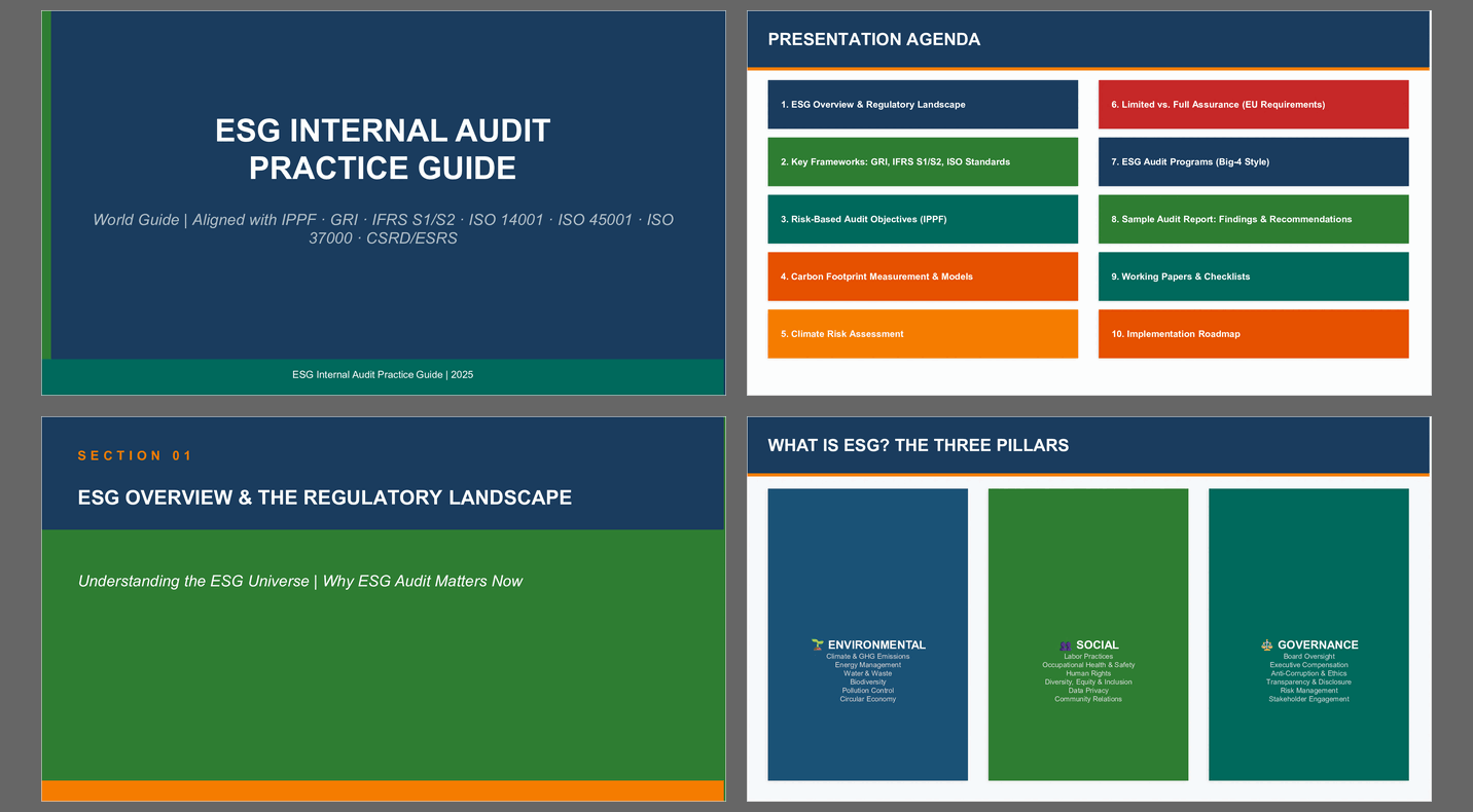 The ESG Internal Audit Practical Guide provides a structured and practical roadmap for auditors and risk professionals seeking to evaluate ESG programs with rigor and credibility. Anchored in internationally recognized frameworks such as ISO 31000, ISO 14001, ISO 45001, and sustainability reporting frameworks including Global Reporting Initiative (GRI) Standards and IFRS S1, the guide translates ESG theory into practical audit methodologies, working papers, checklists, and assurance procedures.