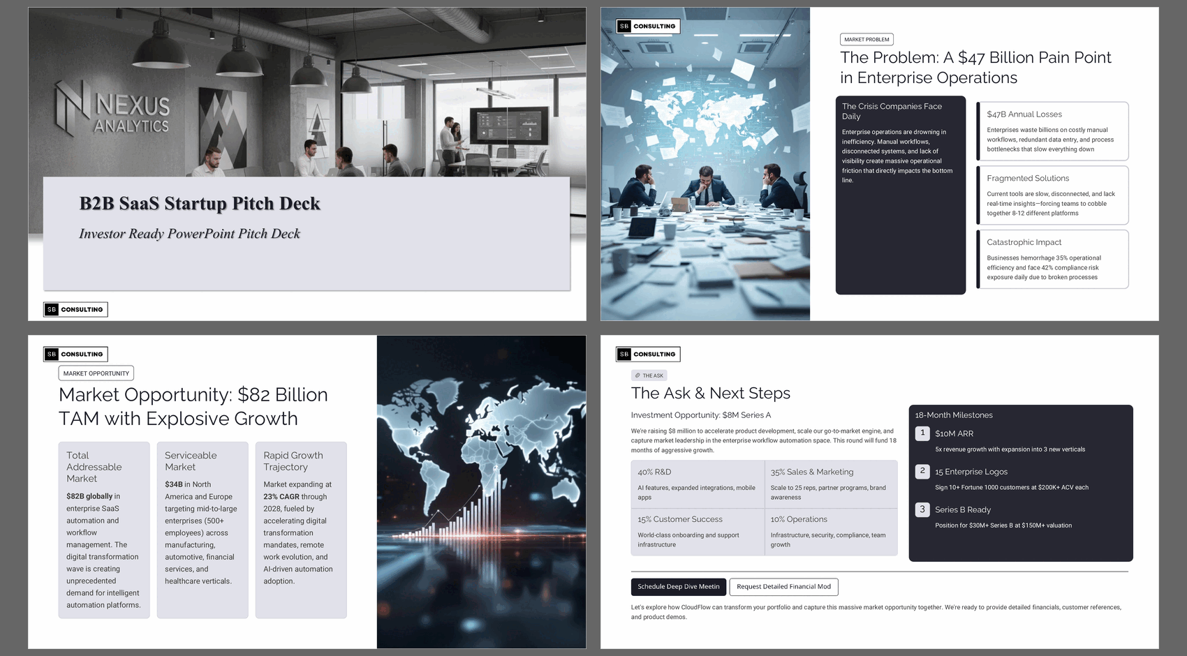It is a strategically structured B2B SaaS pitch framework built around the core sections investors expect to see in professional startup fundraising decks.