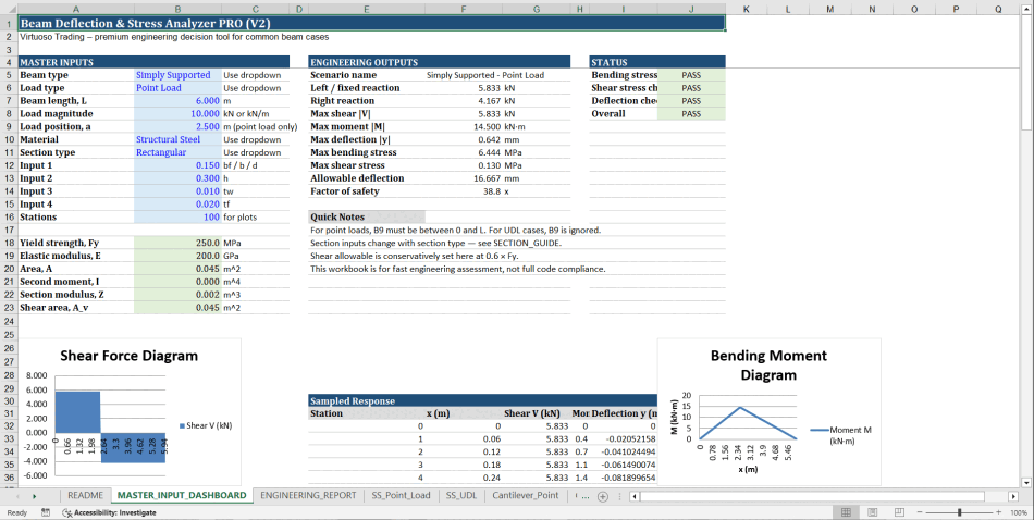Beam Deflection & Stress Analyzer PRO (Excel Toolkit) is a professional engineering solution designed to help users quickly evaluate beam performance under common loading conditions without relying on complex simulation software. Built for practical, real-world use, this tool enables engineers to calculate shear force, bending moment, deflection, and stress with speed and accuracy.