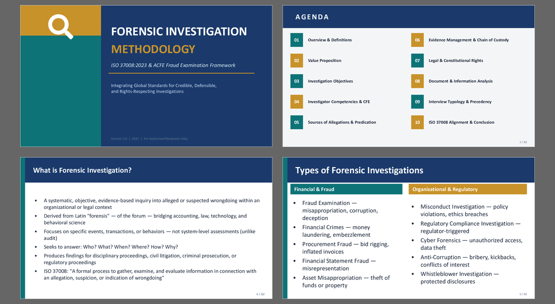 This practical guide integrates the internationally recognized ISO 37008:2023 standard on Internal Investigations of Organizations with the globally respected ACFE Fraud Examination Methodology, creating a unified investigative framework designed for real-world application. It equips fraud examiners, internal auditors, compliance leaders, legal counsel, and investigators with the tools required to move from allegation to evidence-based conclusions while preserving fairness, integrity, and legal defensibility.