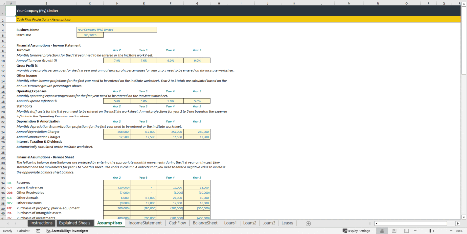 This sheet contains the input values used to automate certain cash flow projection calculations. The reporting periods included in the income statement, cash flow statement, and balance sheet are determined by the start date specified at the top of the sheet. Additional assumptions include annual turnover growth, annual expense inflation, inventory levels, trade receivables, trade payables, payroll accruals, sales tax, income tax, loan terms, opening balance sheet balances, and dividends.