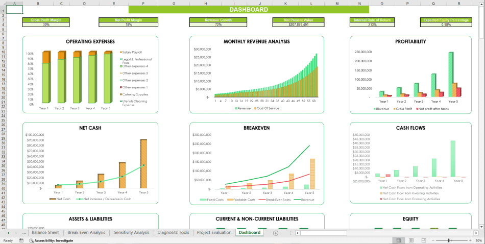 1. Financial Performance Visualization: Displays key metrics like revenue, costs, profits, and cash flows.