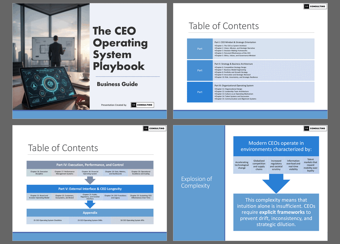 The CEO Operating System Playbook (CEO OS) is a 400+ slide, battle-tested PowerPoint framework built for founders, CEOs, and executive teams who are done improvising leadership and want a repeatable system to scale strategy, execution, people, and performance—without burning out or blowing up the business.