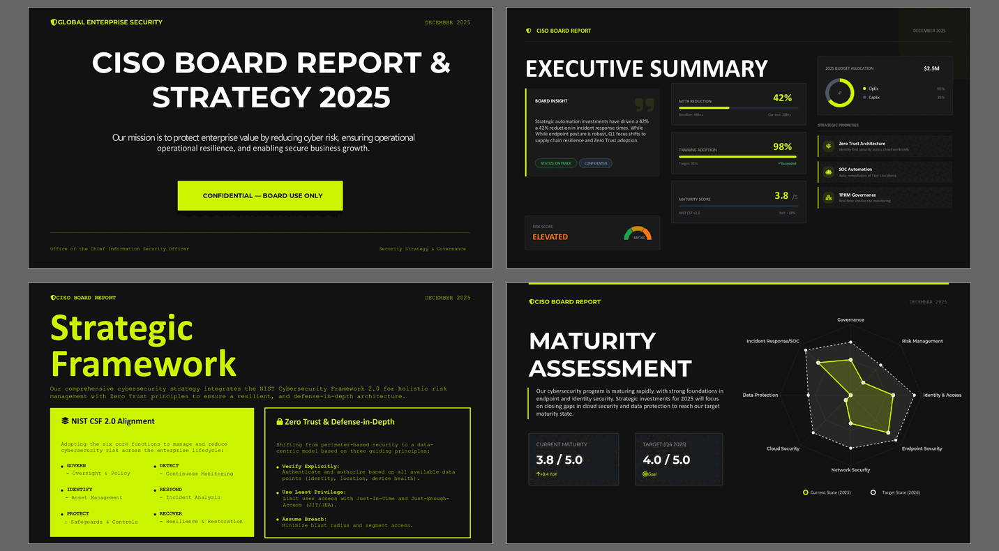 Skip the 20+ hours of designing and developing board-ready security narratives. Get a battle-tested, professionally-designed deck that boards recognize and respect. Customize with your risk data, budget figures, and timeline in just a few hours.