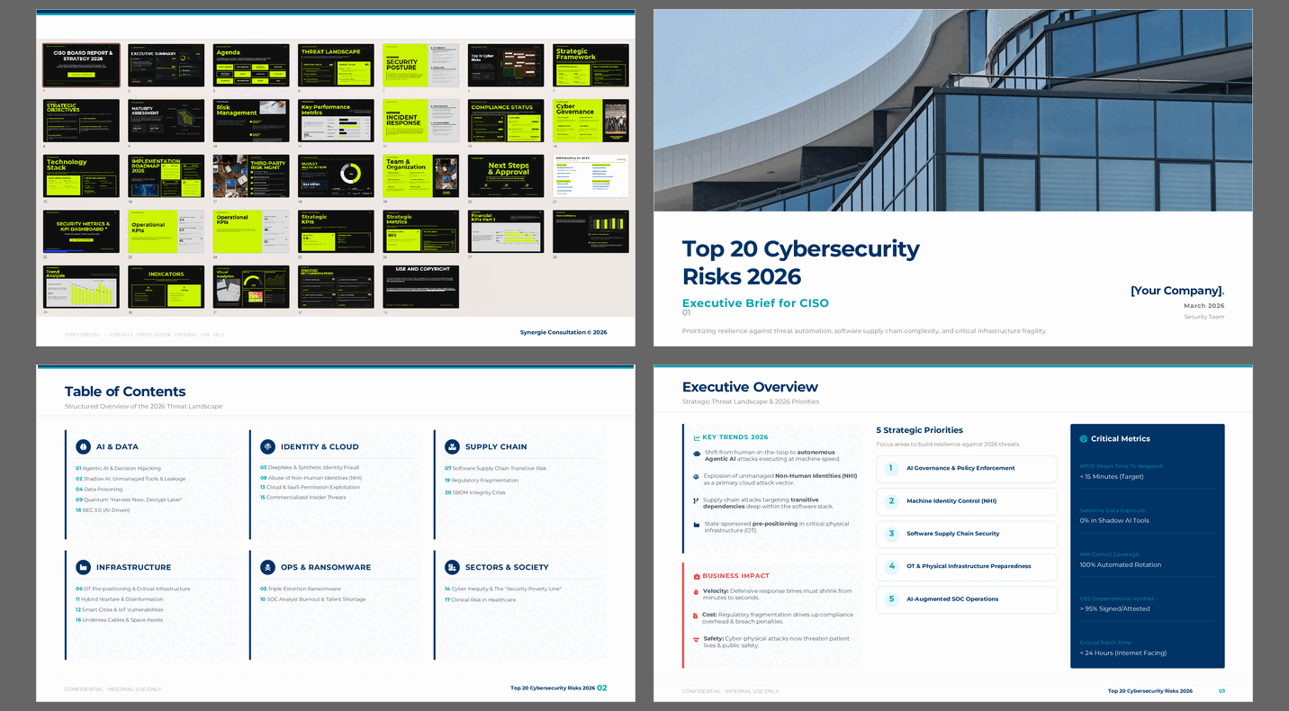 A board-ready presentation of the 20 most critical cyber risks facing organizations in 2026, including AI-enabled threats, identity attacks, and supply chain exposure.