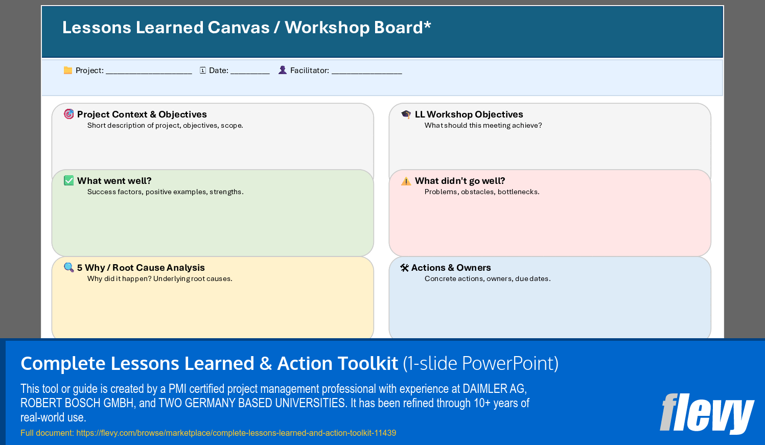 Actionable Lessons Register (in Excel): A structured database to log insights, analyze root causes, and define concrete, measurable improvement actions with clear ownership and deadlines.