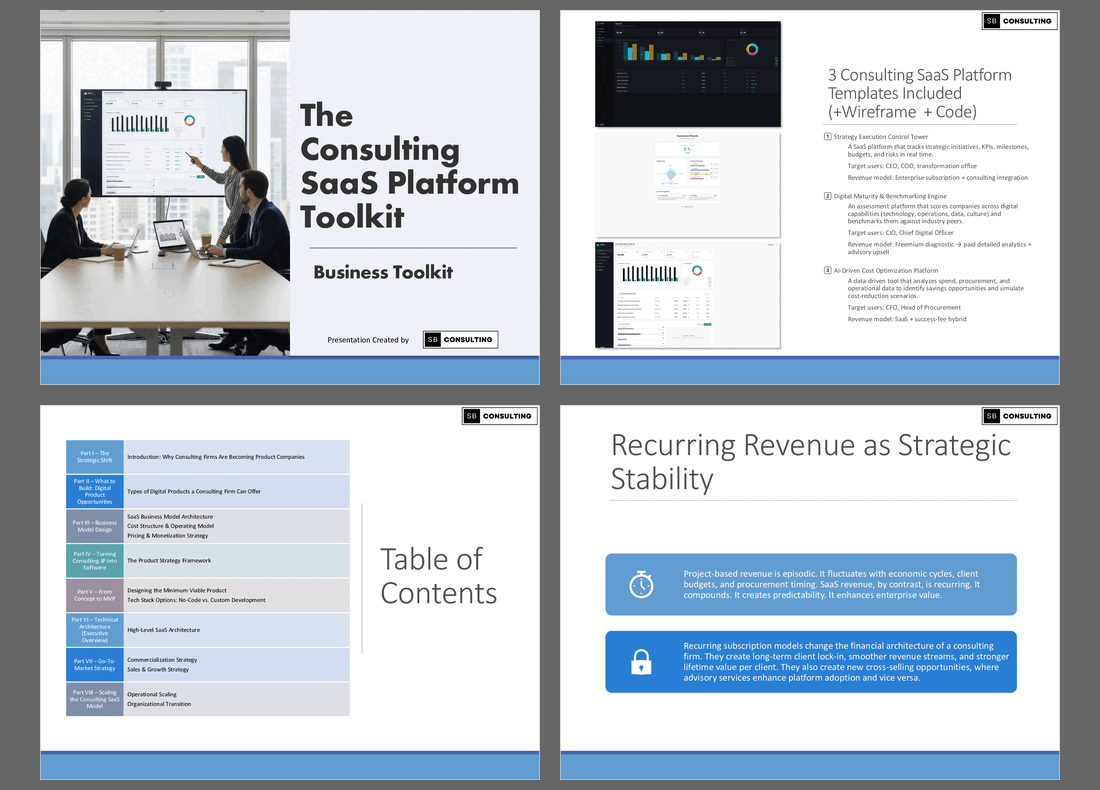 If you have structured methodologies, frameworks, assessments, or transformation programs – this toolkit helps you architect the transition into SaaS.