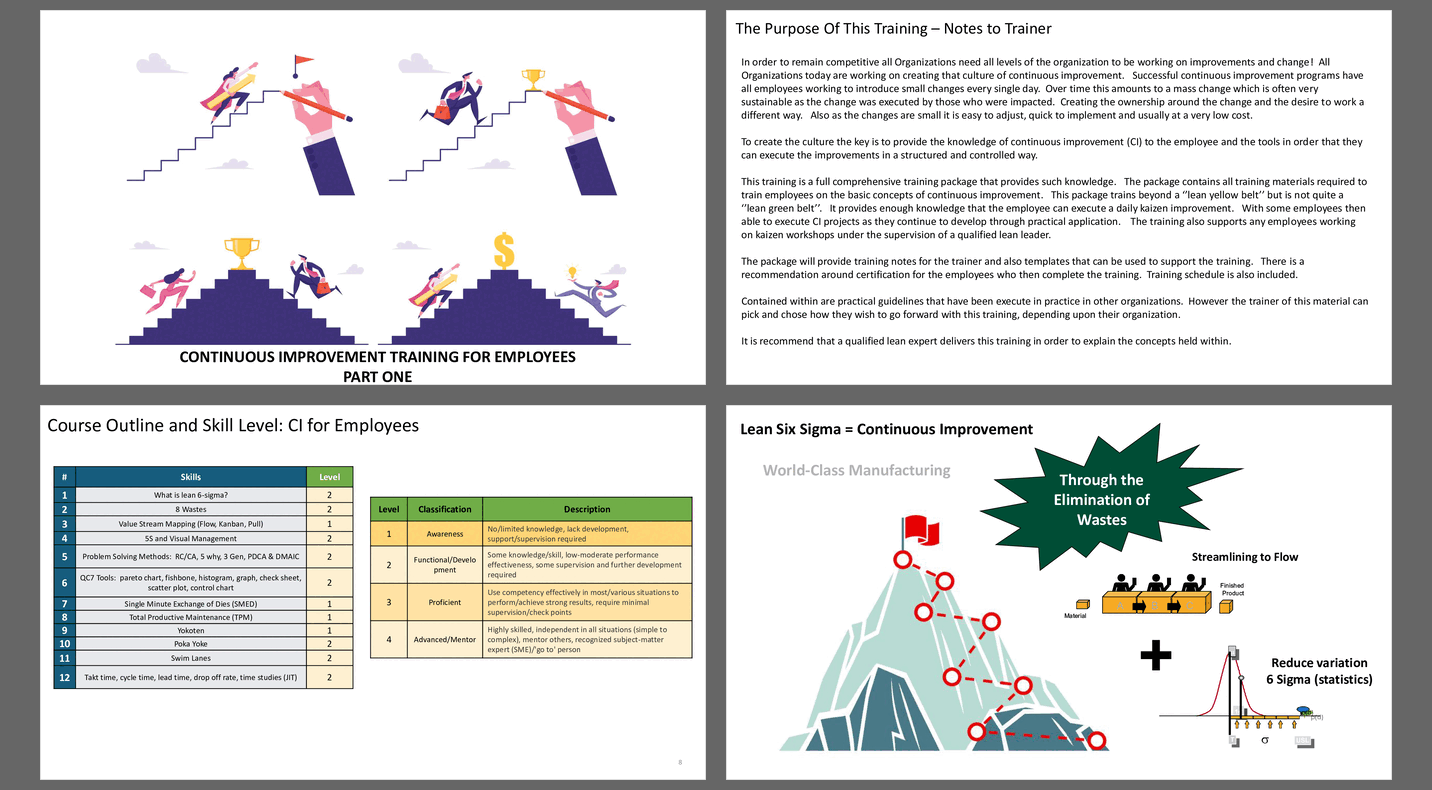 This training is a full comprehensive training package that provides such knowledge. The package contains all training materials required to train employees on the basic concepts of continuous improvement. This package trains beyond a ‘'lean yellow belt'' but is not quite a ‘'lean green belt''. It provides enough knowledge that the employee can execute a daily kaizen improvement. With some employees then able to execute CI projects as they continue to develop through practical application. The training also supports any employees working on kaizen workshops under the supervision of a qualified lean leader.