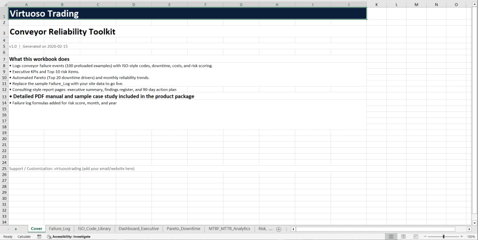 This tool is ideal for reliability engineers, maintenance managers, plant engineers, planners, and consultants who want a professional way to analyze conveyor failures and present findings clearly. It can be used as an internal plant improvement tool, a consulting diagnostic workbook, or a commercial reliability product for clients. With sample data already included, users can see the system working immediately, then replace the examples with real site data to build a live conveyor reliability intelligence dashboard. The result is a simple but powerful way to move from reactive maintenance toward structured, failure-mode-based reliability improvement.