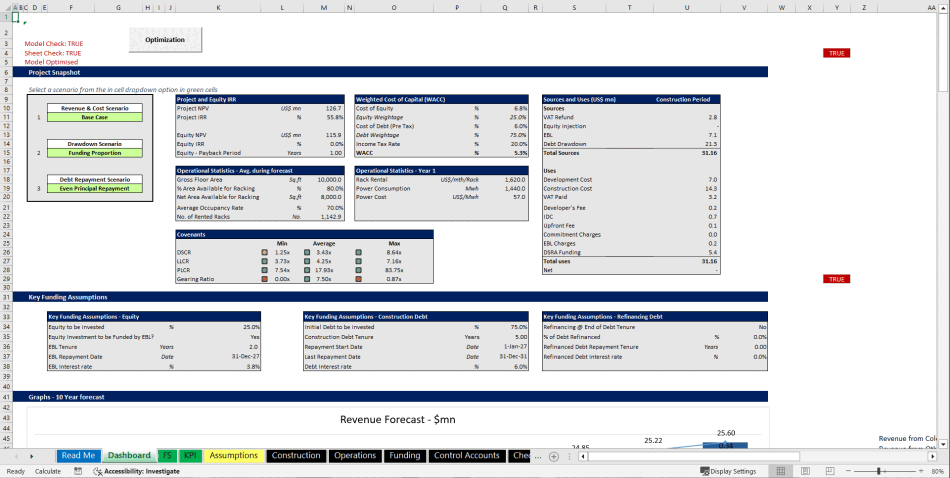 4. The Debt funding drawdown has 3 scenarios that can help users assess the impact on the IRR and make the best possible negotiations with the financial institutions.