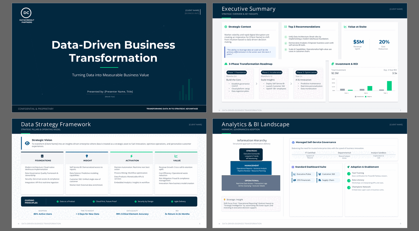 This comprehensive 26-slide PowerPoint deck provides a proven, end-to-end framework for becoming an insights-driven enterprise. Titled "Data-Driven Business Transformation 2025 Framework," it guides you through the complete journey: from assessing your digital readiness, to implementing modern cloud architecture, to operationalizing AI/ML systems that drive revenue and reduce costs.