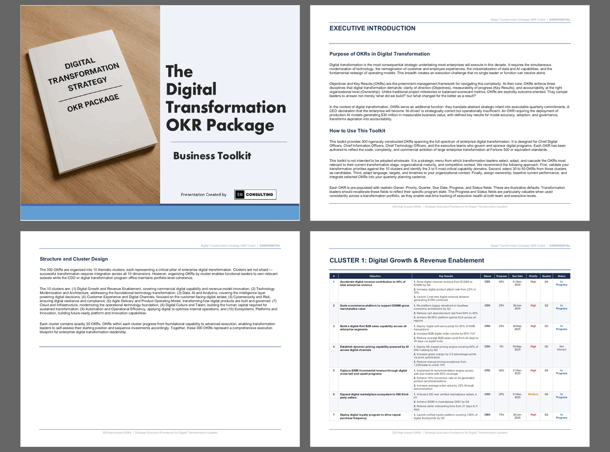 The Digital Transformation OKRs Library is a high-impact, enterprise-grade system of 300 ready-to-deploy OKRs designed to help CIOs, CDOs, and transformation leaders drive measurable results across the entire organization – not just talk about them.