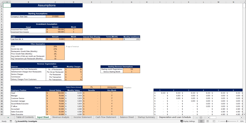1. Enter Assumptions: Input Order volume, Restaurant signups, delivery price, and business operation costs.