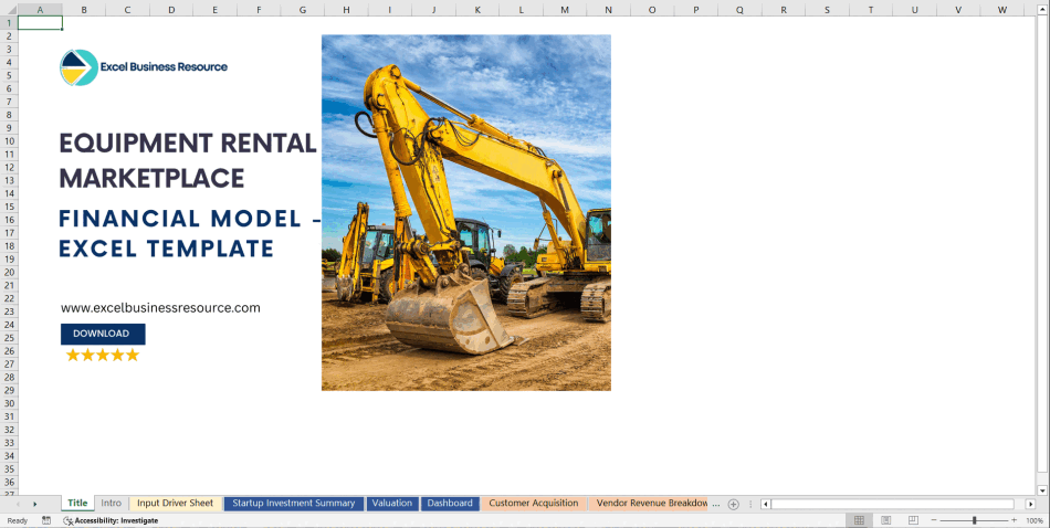 Download this Construction Equipment Rental Marketplace Financial Projection Model to build a clear, investor-ready forecast for your startup without starting from scratch. This simple, ready-to-use spreadsheet is designed for equipment rental marketplace startups, peer-to-peer equipment rental platforms, and founders who want a professional financial model for fundraising, planning, and valuation.