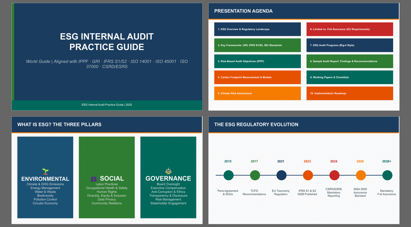 The ESG Internal Audit Practical Guide provides a structured and practical roadmap for auditors and risk professionals seeking to evaluate ESG programs with rigor and credibility. Anchored in internationally recognized frameworks such as ISO 31000, ISO 14001, ISO 45001, and sustainability reporting frameworks including Global Reporting Initiative (GRI) Standards and IFRS S1, the guide translates ESG theory into practical audit methodologies, working papers, checklists, and assurance procedures.