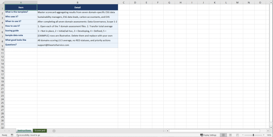 This is not a slide deck or a high-level guide. It is a working operational toolkit with 64 files, 349+ tabs, and 2,730+ rows of actionable content. Every assessment, every runbook, and every template is ready to use from the moment you download. Purchase now for instant access to the complete ESG Data Management and Carbon Accounting Playbook.