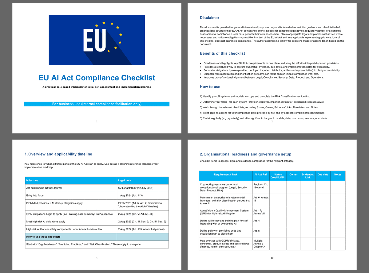 EU AI Act Compliance Checklist is a practical, business-focused workbook designed to help organisations structure their early EU AI Act compliance efforts in a more organised, usable, and cross-functional way. Rather than leaving teams to work through complex requirements in fragmented legal, operational, and technical discussions, this workbook gives them a clear working document to support initial self-assessment, planning, ownership tracking, and implementation preparation. It is especially useful for organisations that want a more disciplined starting point for identifying in-scope AI systems, classifying risk, determining relevant operator roles, and translating requirements into practical actions.