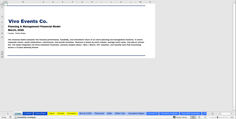 This comprehensive, fully integrated financial model evaluates the feasibility, operational scalability, and investment return of an Event Planning and Management business. Built using financial modeling best practices, it provides a dynamic 10-year planning horizon covering corporate events, social celebrations, conferences, and private functions. Whether you are seeking funding, managing a growing agency, or analyzing strategic pivots, this model delivers clear, investor-ready insights through automated three-statement financials, DCF valuation, and visual dashboards.