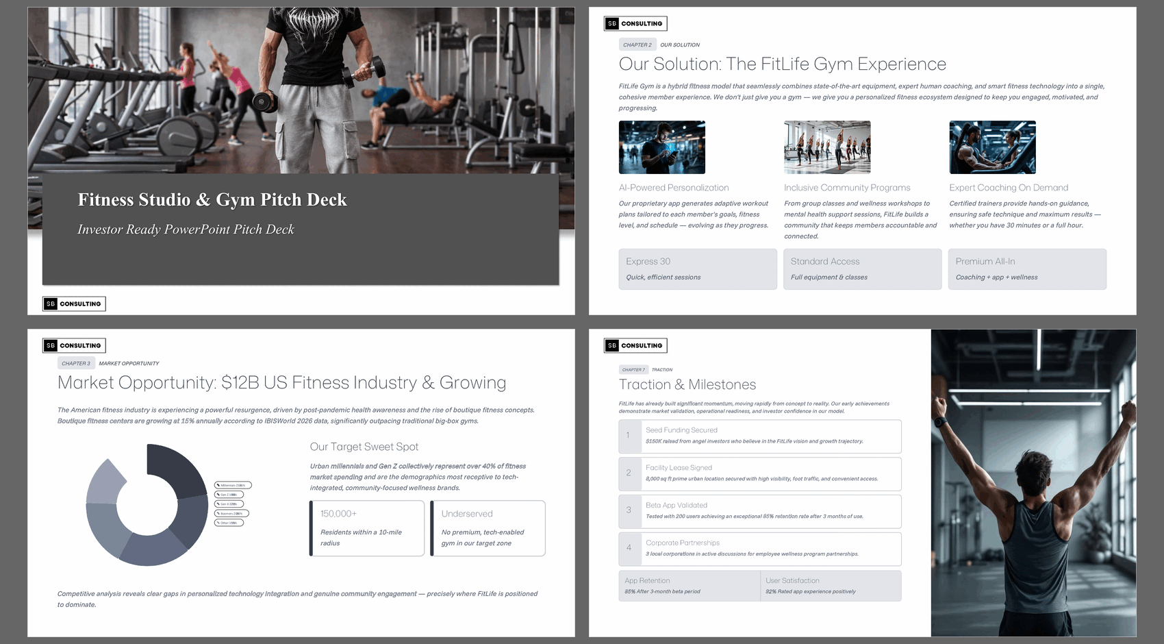 Get the Fitness Center / Gym Pitch Deck Template now and start presenting like a business investors can't ignore.