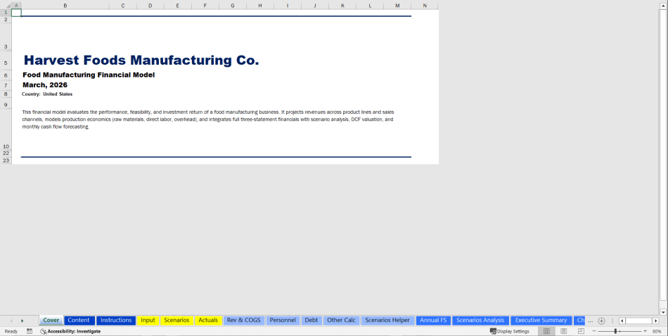 Founders and operators building a credible business plan or seeking funding. Investors and analysts underwriting a food manufacturing acquisition or investment. CFOs and finance teams replacing slow, error-prone spreadsheets with a clean, auditable model.