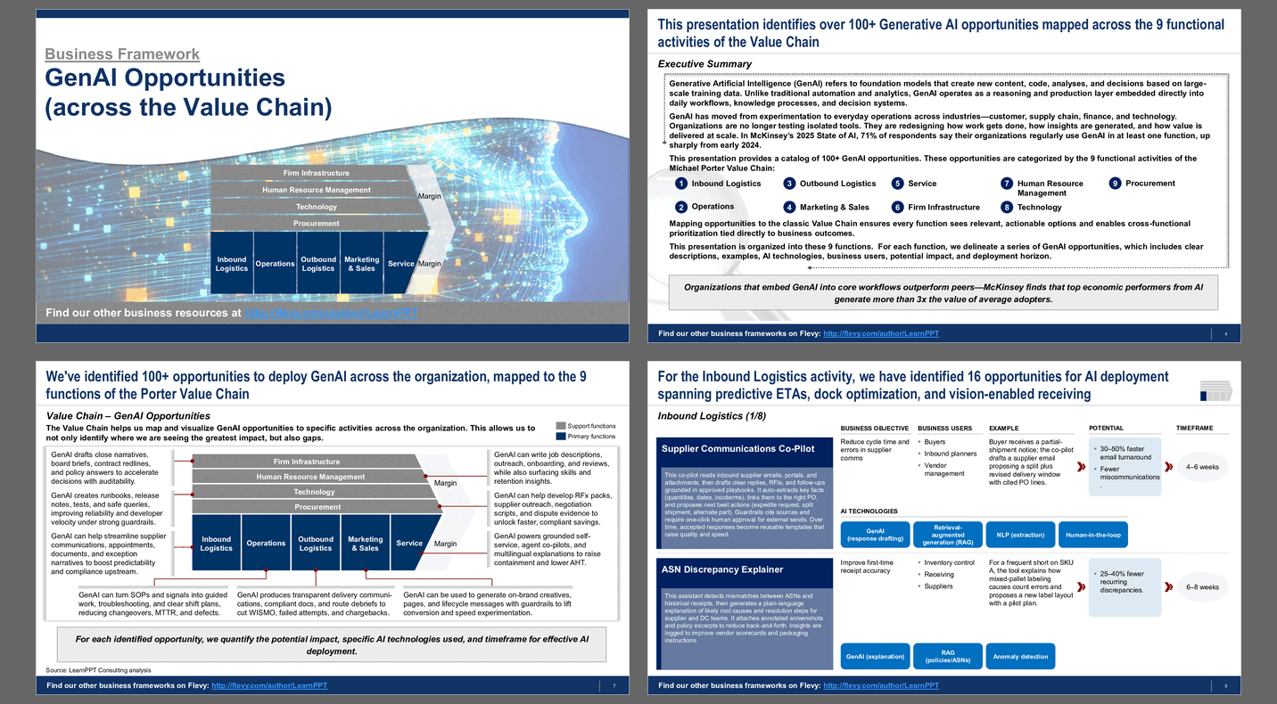 This PPT presentation provides a catalog of 100+ GenAI opportunities. These GenAI opportunities are categorized by the 9 functional activities of the Michael Porter Value Chain: