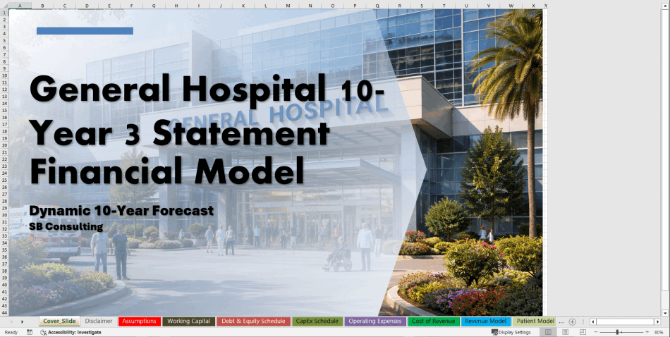 All inside one structured, professional-grade general hospital financial model – 10-year forecast.