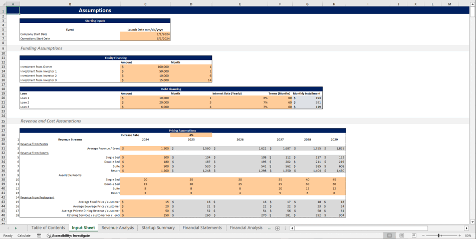 Thinking of starting a hotel or resort but unsure about the financials? This Hotel & Resort Excel Financial Model Template is designed to simplify financial planning for the hospitality industry. Whether you're a first-time hotel investor, an established hotelier, or seeking potential investors, this tool helps you analyze costs, revenues, and profitability with transparent and easy-to-understand formulas. This financial projection model covers everything from initial investment requirements to revenue streams, ensuring you have a clear roadmap for your hotel finances. With an advanced 5-year financial plan, you can make informed budget decisions, evaluate operational profitability, and assess the investment potential of your hotel project.