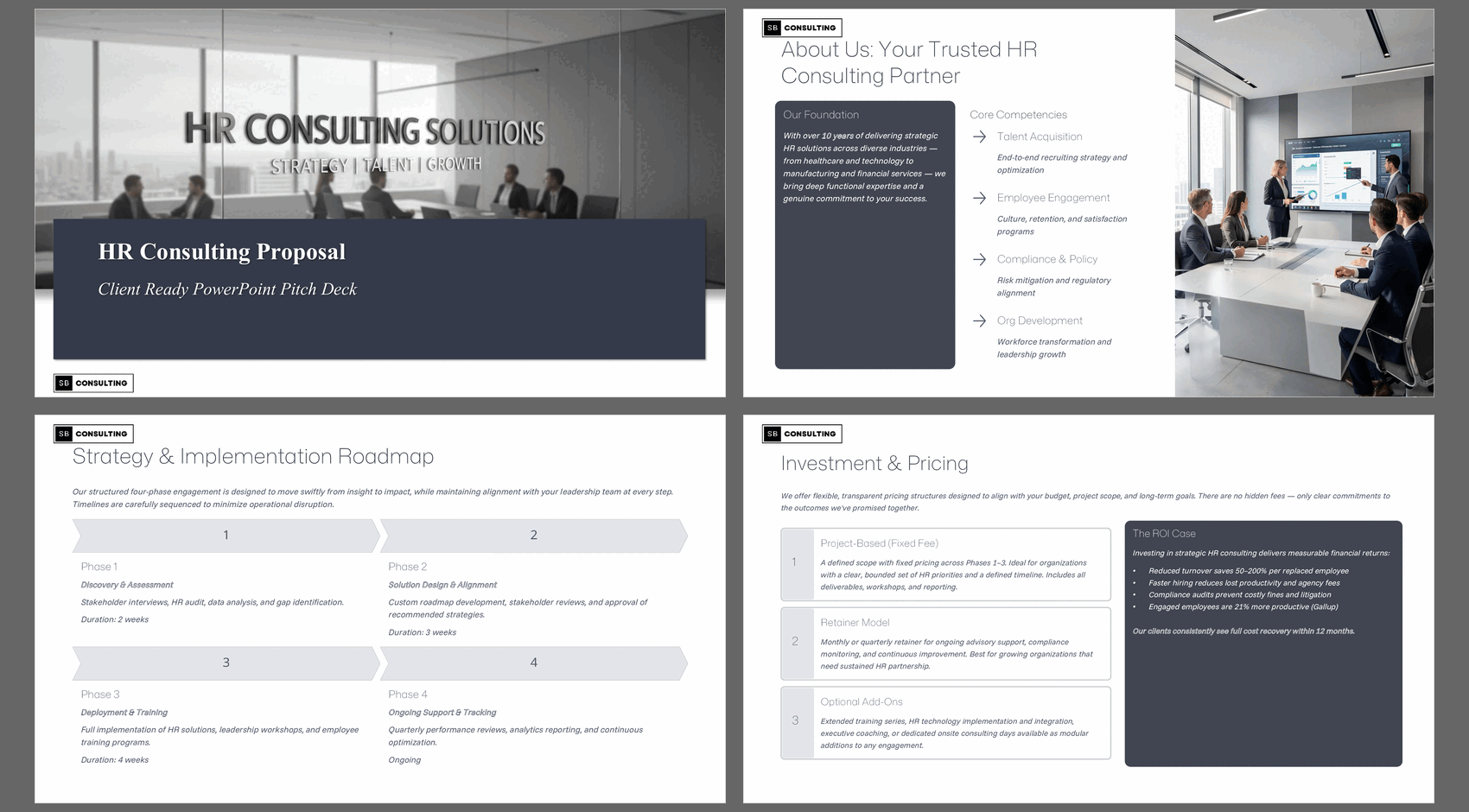 Download now and transform your HR consulting proposals into powerful, executive-ready deal-closing presentations.