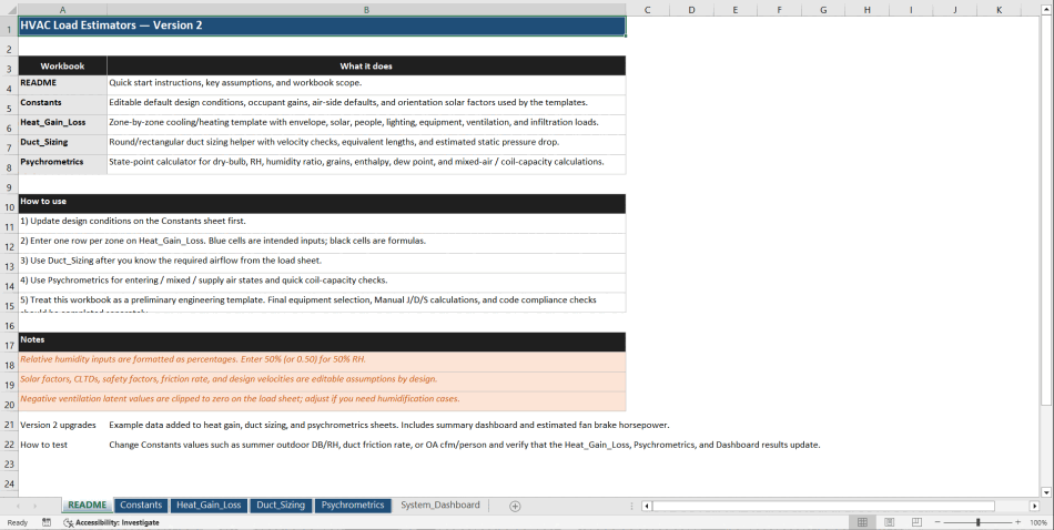 Design HVAC systems with confidence using this advanced, engineering-grade Excel toolkit built for real-world applications. The HVAC Load Estimators V2 is a comprehensive solution for calculating heat gain/loss, sizing duct systems, and performing psychrometric analysis—eliminating guesswork and reducing costly design errors.