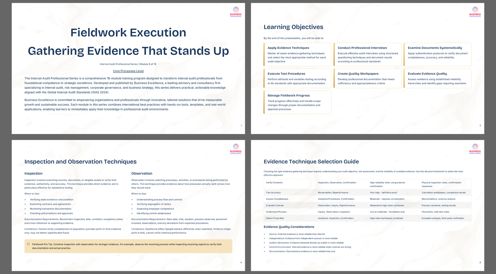Module 8: Fieldwork Execution provides the complete methodology for gathering evidence that stands up to scrutiny. This module equips auditors with professional techniques for conducting effective fieldwork, from evidence gathering through workpaper documentation and progress management.