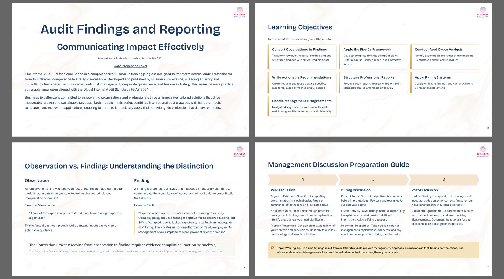 Module 10: Audit Findings and Reporting provides the complete methodology for communicating audit impact effectively. This module equips auditors with professional techniques for transforming observations into actionable findings and creating reports that drive meaningful organizational change.