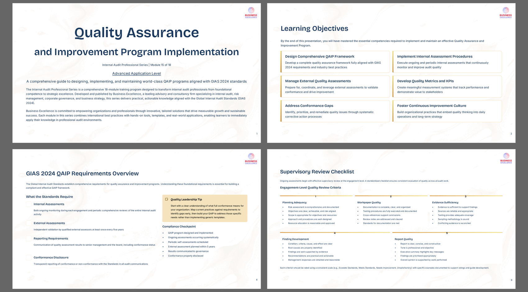 Module 15: Quality Assurance and Improvement Program Implementation provides comprehensive guidance for designing, implementing, and maintaining world-class QAIP programs. This module equips CAEs and audit leaders with practical frameworks for ensuring conformance with GIAS 2024 standards while driving continuous improvement in audit quality and effectiveness.