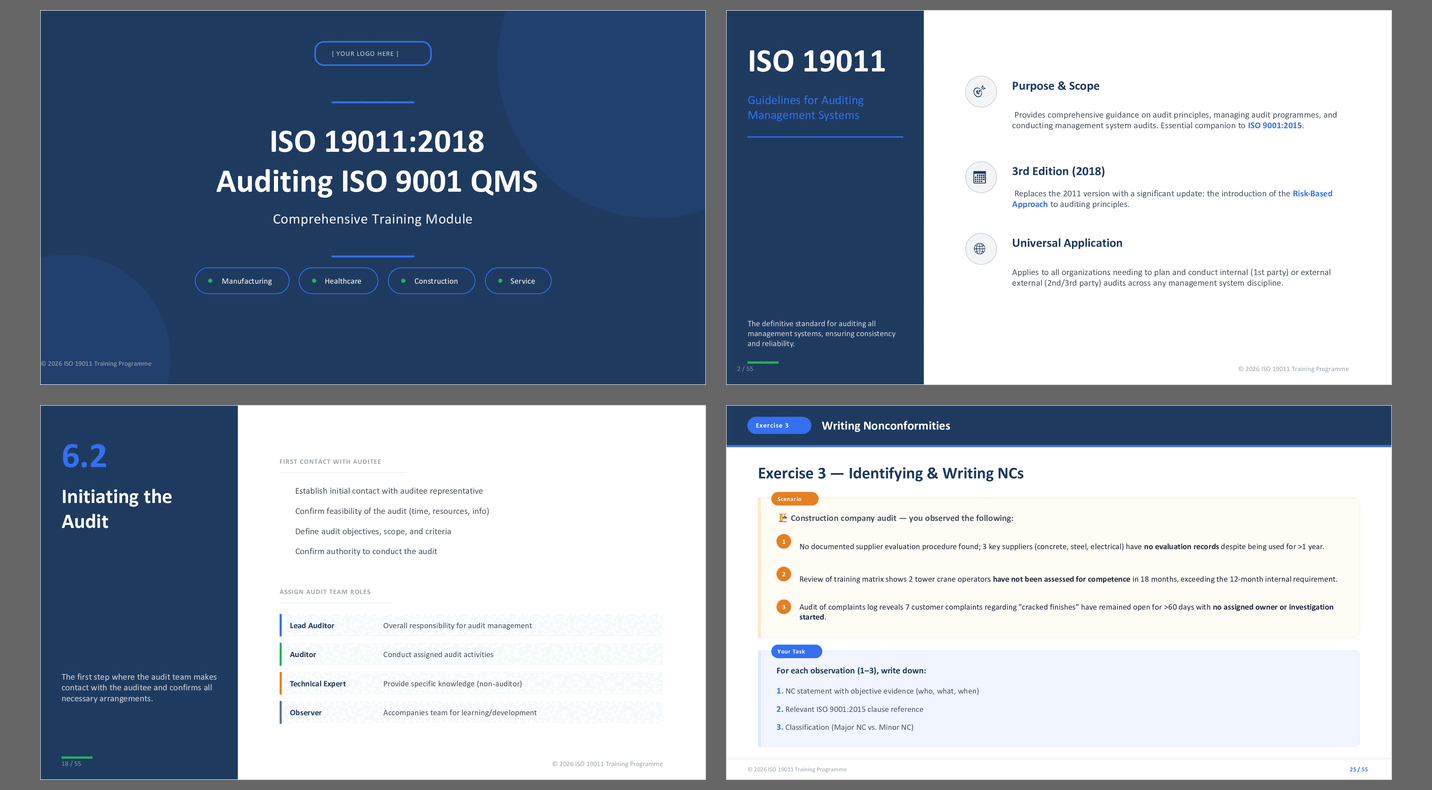 This comprehensive training package provides everything needed to deliver professional ISO 19011:2018 auditing training for ISO 9001:2015 Quality Management Systems. Designed by experienced IRCA auditors and quality management consultants, this module combines theoretical knowledge with practical application through real-world exercises and sector-specific examples.