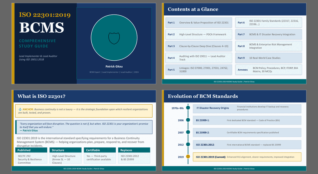 In a world where disruption is no longer the exception but the expectation, organizations that survive and thrive are those that prepare deliberately and recover decisively. The ISO 22301 Business Continuity Management System Comprehensive Study Guide is written for professionals who refuse to leave resilience to chance. Whether you are pursuing the ISO 22301 Lead Implementer or Lead Auditor certification, or simply seeking to build a world-class BCMS within your organization, this guide is your authoritative companion. Developed with African and global contexts in mind, it moves beyond theory to deliver clause-by-clause mastery, audit-ready intelligence, and integration frameworks that connect ISO 22301 with ISO 27001, ISO 31000, ISO 27031, ISO 24762, and ISO 37000 – giving you a 360-degree view of enterprise resilience governance.