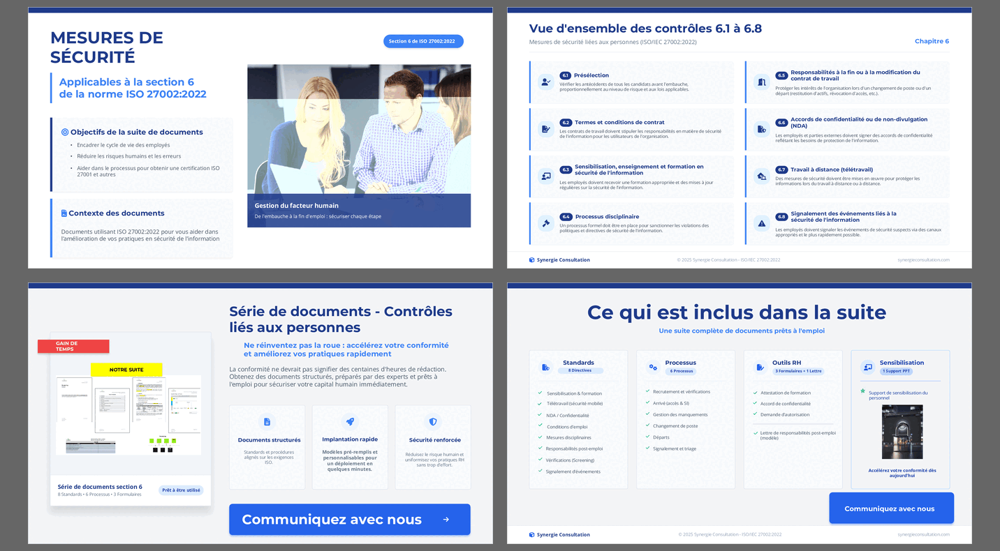 De nombreuses initiatives ISO 27001 échouent ou ralentissent non pas à cause de la technologie, mais parce que les mesures liées aux personnes sont peu claires, appliquées de manière incohérente ou insuffisamment documentées. Ce package accélère l'implémentation en couvrant le cycle de vie complet des employés. De la pré-embauche aux obligations post-emploi. Avec une approche cohérente qui réduit les risques pour les personnes, améliore la gouvernance et soutient la préparation aux audits.