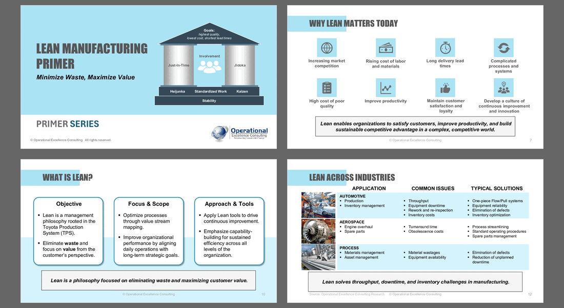 Developed by Operational Excellence Consulting, each Primer is designed to be facilitation‑ready, practical, and credible. Unlike generic training materials, our Primer Series is built by practitioners with decades of transformation experience, ensuring every deck combines clear frameworks, proven tools, and interactive activities. This consistency across topics (5S, Kaizen, Lean, Problem Solving, Design Thinking, and more) makes the series a trusted resource for consultants, trainers, and organizations seeking structured, high‑impact learning.