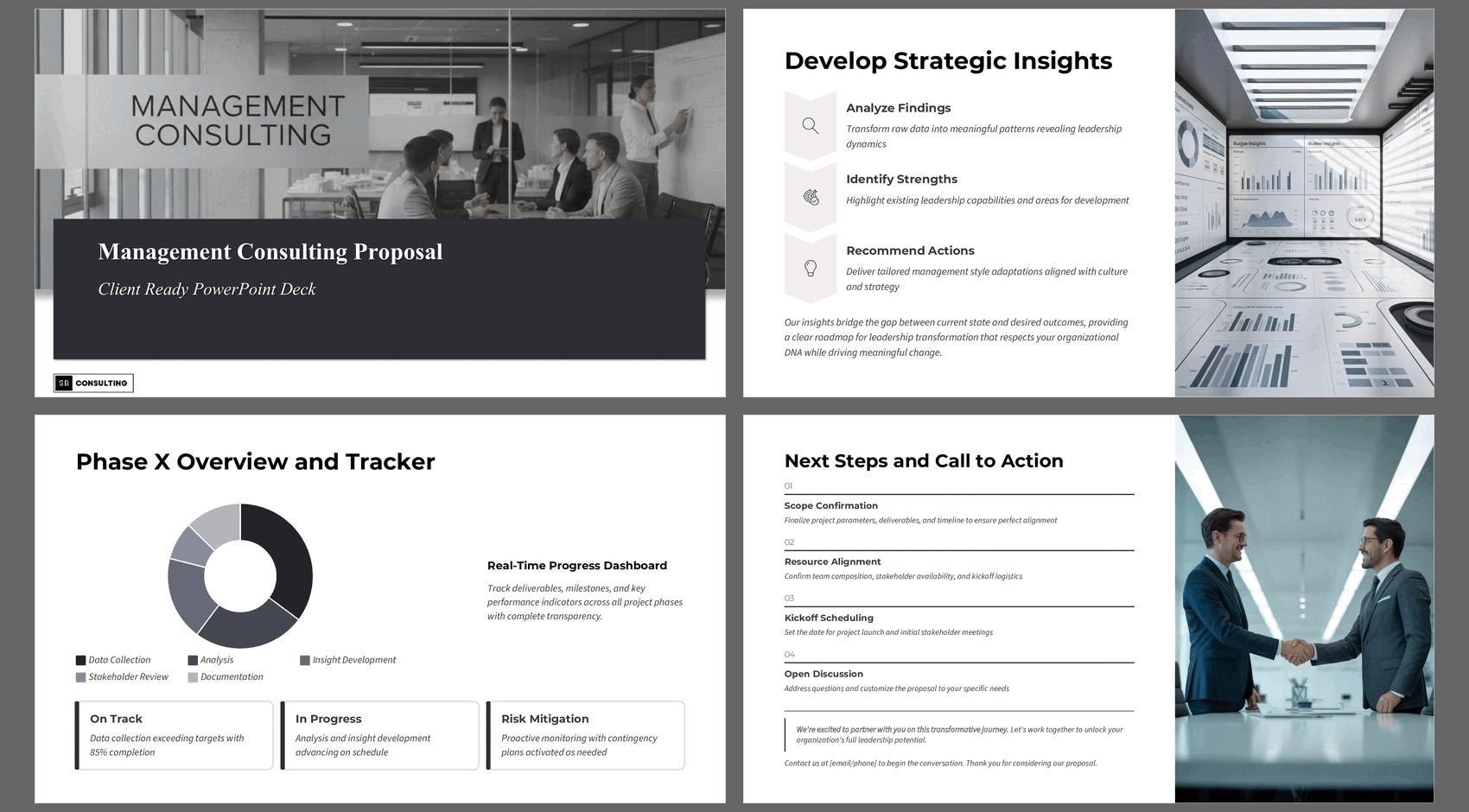 This section shows governance logic, performance visibility, and progress oversight – elevating the engagement from "consulting advice" to managed strategic transformation.